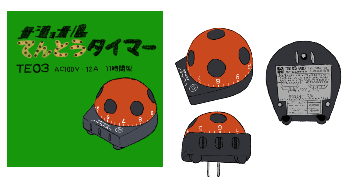 “テントウムシの背中がタイマーのダイヤルになっていて土台の部分にコンセントが付いているアナログタイマーが、白いテーブルの上に置いてある”
