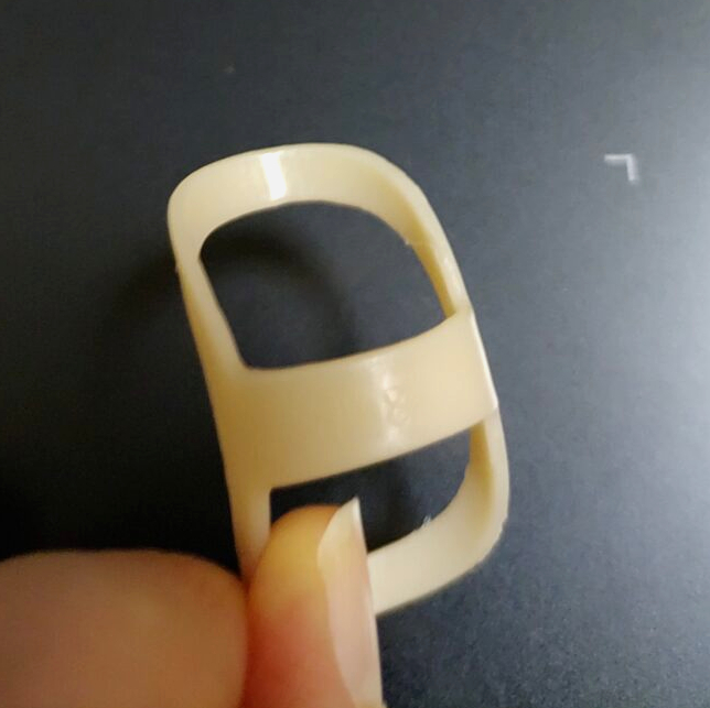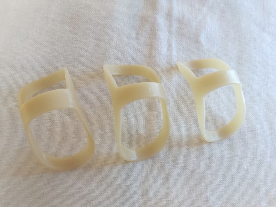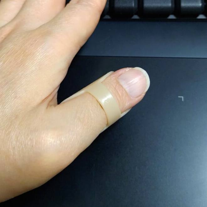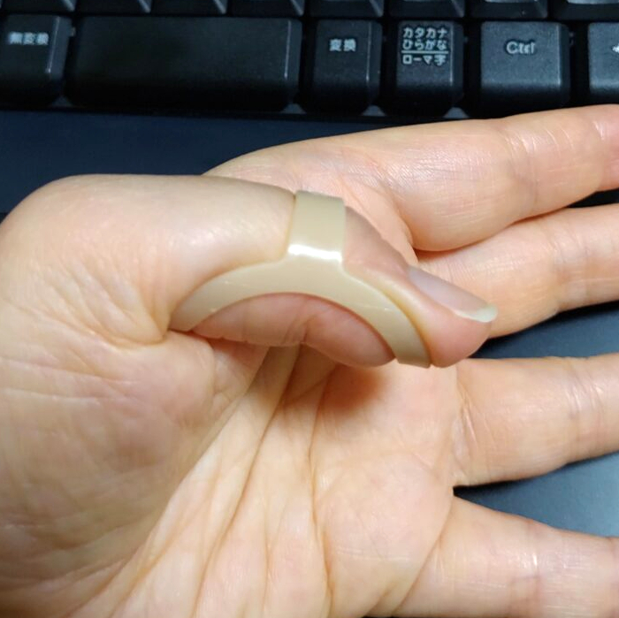 指の過伸展を防ぐために指輪のように指にはめて使うものなのですが、状況に応じて裏表を変えたりと面白い使い方をします。