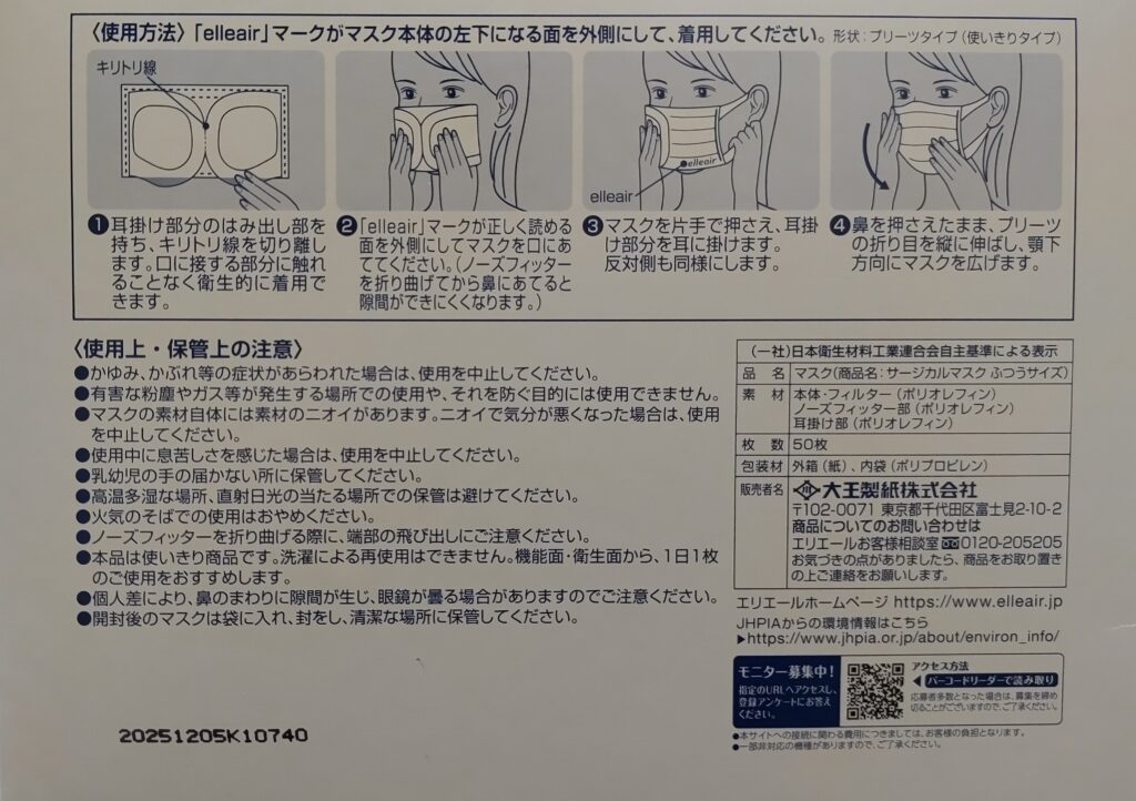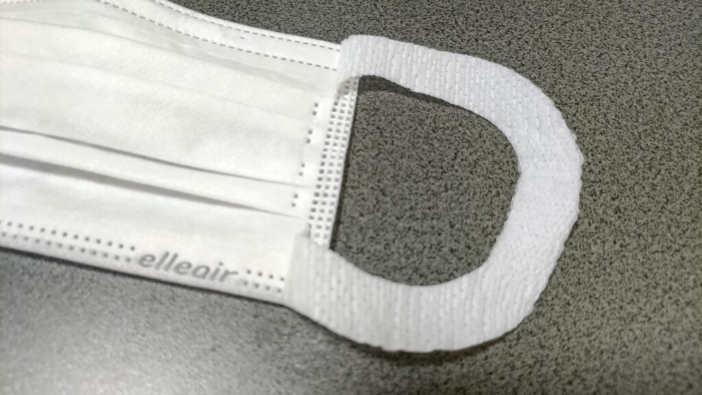 サイズはワンサイズのみ。特徴はふんわりとした幅広のゴムひもです。これが「こんな不織布みたいなものが伸びるの?」と疑問で、伸びが悪くて耳が痛くなるんじゃないかと若干不安がありましたが、実際につけてみると、食い込みもないですし、さすがに一般的なゴムひもほど伸びませんが、耳にかけるときに問題ないくらいは伸びます。でも(私にとっては)長さが長かったのでゴム